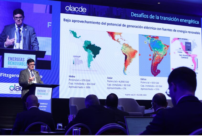 La Organización Latinoamericana y Caribeña de Energía (OLACDE) participó en la XIII Conferencia Energías Renovables Perú 2026, espacio regional en el que se analizaron los avances, desafíos y oportunidades de la transición energética en América Latina y el Caribe. En representación de la Organización, Fitzgerald Cantero Piali, Director de Estudios, Proyectos e Información, expuso sobre “El rol de las energías renovables en la transición energética: avances y desafíos en América Latina”.
